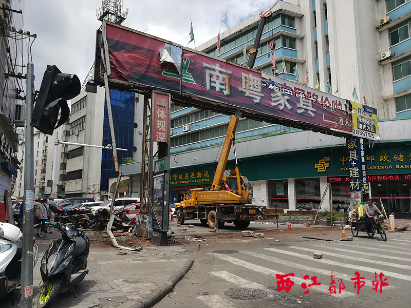 ??? 近日,萬秀區城管大隊執法人員在工廠一路用吊機拆除破損嚴重的廣告牌。據悉,今年以來,梧州市持續開展市容環境整治年活動,包括整治亂擺賣,修復城市破損道路,拆除破舊廣告牌,恢復綠化等。西江都市報記者 吳艷虹 攝