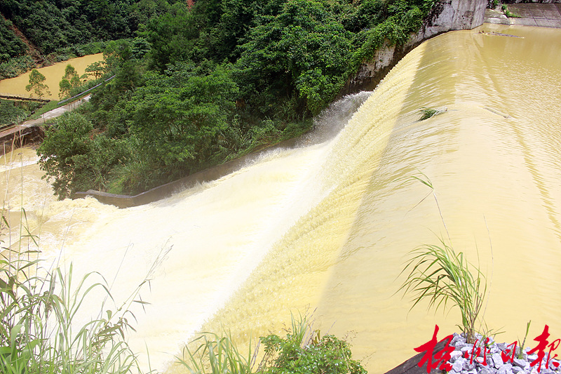 ????連日來,蒙山縣持續強降雨,山洪暴發,瓦沖水庫水位猛漲,超過汛限水位。當地黨委、政府組織下游群眾轉移安置后,按汛期運行方案安排水庫泄洪。江永錄 攝