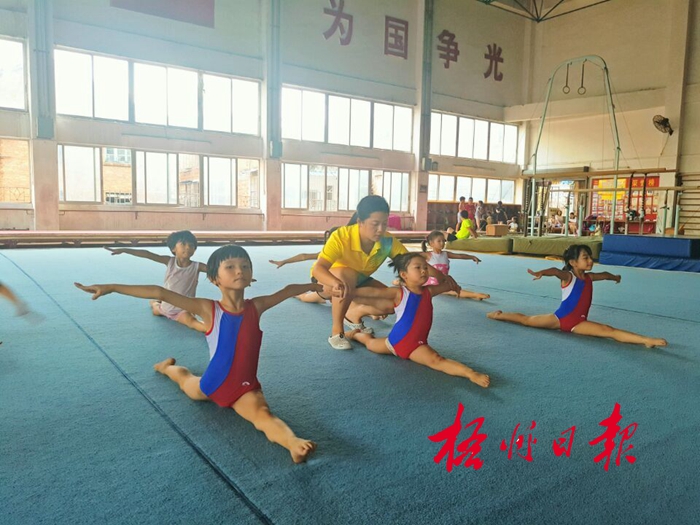 6月29日,在市體校體操隊訓(xùn)練館,教練正指導(dǎo)孩子們練習(xí)基本功。 曾韻 攝