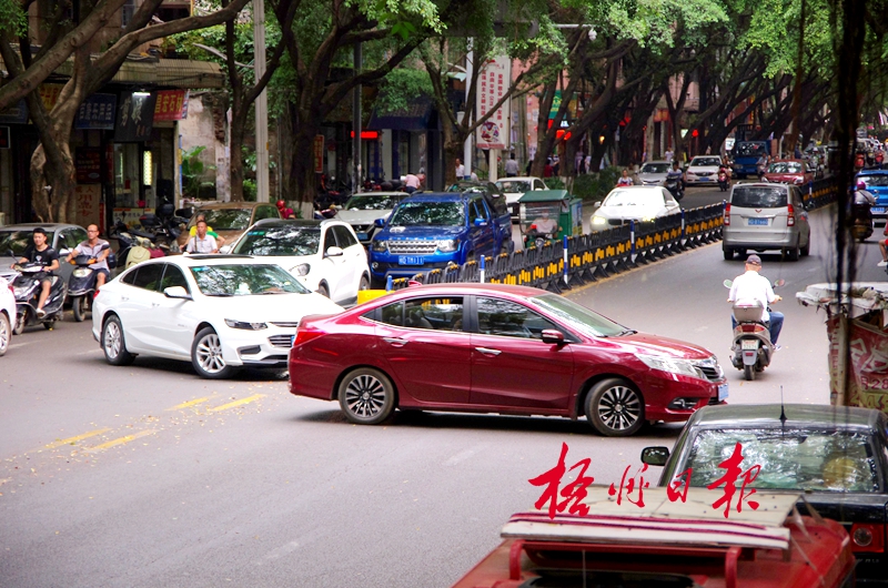 ????7月14日,交警部門在文瀾路口至珍寶巴士公司路段設置了隔離護欄,將雙向行駛的車輛分流。7月20日下午,記者在現場走訪時看到,隔離護欄將該路段左右分隔開來,車輛在中央護欄兩側有序行駛。需要進入旺城廣場,從文瀾路往富民路方向行駛的車輛在珍寶巴士公司對出路口處掉頭。每當有多輛小轎車連續在此掉頭行駛時,阻礙了后方車輛與對向行駛的車輛通行,造成了短時間的堵塞。