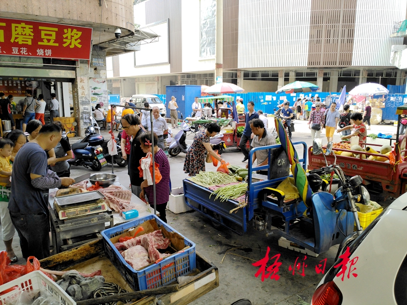 ????記者注意到,在約8時一刻前后一個小時里,來這里買東西的市民人數最多,多是退休的大嬸大叔。“年紀大了,不想走遠,來這里很方便,下樓走兩步就到了。”家住工廠一路的李阿姨告訴記者,她經常過來買菜,很少去新興市場和大塘市場了。也有不少市民騎著電動車在攤販前停下來,匆匆買完菜就走。
