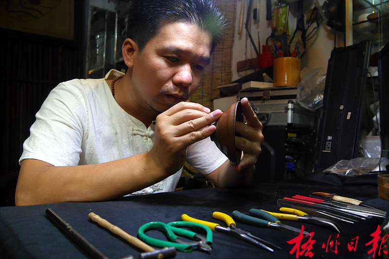 ????“剛剛開始并不順利,去地攤搜羅回來的那些殘器練手,效果不如人意,后來身邊的朋友為我介紹了一些外地前輩,通過有經(jīng)驗前輩的指點,才算慢慢入了門。”覃泓月告訴記者,梧州有一個茶莊老板酷愛收藏紫砂壺,正巧手中有一些曾經(jīng)摔落磕碰最后以金繕修復手藝修復好的紫砂壺,老板為了幫助他提高金繕修復水平,任由覃泓月將“再生茶器”打包帶回家研究,甚至放心地讓他拆下鋦釘來觀察碰傷裂痕。“金繕修復手藝多傳承于北方匠人之手,我期待著金繕修復手藝在南方在梧州落地生根,且遍地開花。”這是茶莊老板的希冀。