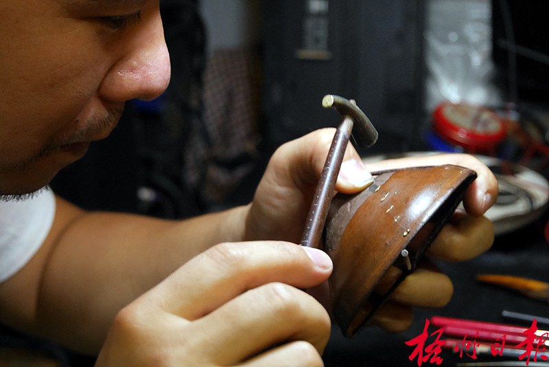 ????深知自己入行不久,技藝欠缺火候,覃泓月對每一次鋦瓷修復都全力以赴。每修復一件器皿,覃泓月會上上下下、里里外外仔細端詳半天,檢查釘子有無松動,接面是否自然。