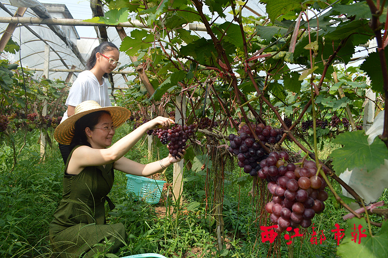 ????8月1日,游客在蒙山縣西河鎮古排村古排嶺坪生態葡萄園內采摘小黑提葡萄。