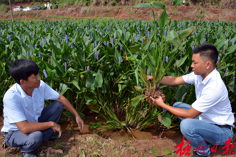 ????8月2日,在藤縣塘步鎮石塘村群鋒水生植物繁育基地,技術人員正觀察梭魚草的生長情況。顏桂海 攝