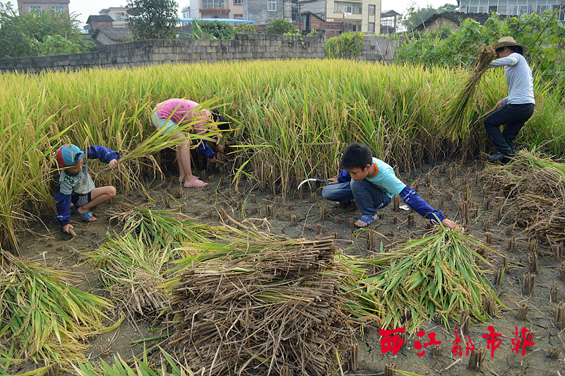 ????8月3日,蒙山縣蒙山鎮洲南村莫家3組的幾名小學生幫助父母收割稻谷。