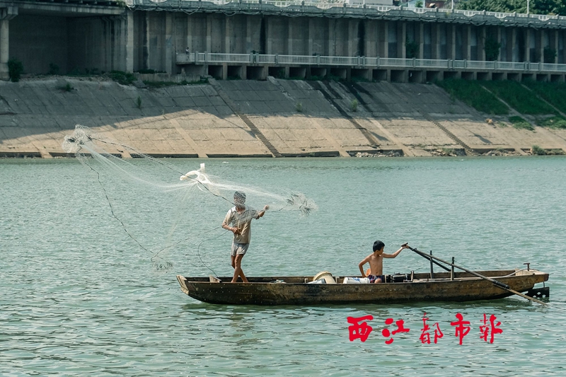 ??? 8月7日,一名小朋友在桂江上幫大人調(diào)整漁船方向。