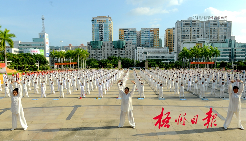 ????當(dāng)天早上,來(lái)自市老年人體育協(xié)會(huì)、武術(shù)協(xié)會(huì)和太極健身運(yùn)動(dòng)隊(duì)的1000名健身愛(ài)好者展演八段錦、健身氣功等健身項(xiàng)目,大家統(tǒng)一穿著白色的練功服,伴隨著柔和的背景音樂(lè)舒緩起手,動(dòng)作整齊劃一,充分展示了健身氣功的魅力。同時(shí),市區(qū)50個(gè)多健身輔導(dǎo)站的700多名成員在旺城廣場(chǎng)開(kāi)展集體健身操、健身舞和抖空竹表演,展示了市民熱愛(ài)健身的精神風(fēng)貌。