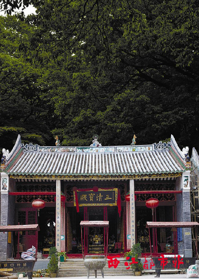 白鶴觀內(nèi)主殿為“三清寶殿”。(資料圖) 另?yè)?jù)白鶴觀內(nèi)的工作人員介紹,兩側(cè)殿分別為“三界殿”和“仙鶴殿”。 因鶴得名景如畫(huà) 值得一提的是,《梧州市志》中對(duì)白鶴觀的屋面有一處細(xì)節(jié)描述:“一般古代官署和住宅的門房、圍墻頂部,采用單坡式;官署廳堂和住宅,采用歇山式;一般民房用雙坡的硬山式或懸山式;寺廟觀宇如白鶴觀,用廡殿式;梧州舊城墻的城樓,用重檐式。”由此可見(jiàn),屋面的制式在古時(shí)候象征著一定的等級(jí)劃分?,F(xiàn)存白鶴觀的主殿是硬山頂人字山墻,說(shuō)明其原身在清朝重修以前,很有可能是一處屋面采用廡殿式的尊貴廟宇。 關(guān)于“白鶴觀”命名的由來(lái),史料中僅有寥寥數(shù)語(yǔ),且?guī)в猩裨捝剩合鄠靼Q山樹(shù)木蔥郁,引來(lái)無(wú)數(shù)白鶴棲息其間。一日,一對(duì)仙鶴落地之后,變成白鶴仙人和仙童,在此落觀修道而得名。盡管如此,我們也能從中擷得關(guān)鍵字——“鶴”。 據(jù)《梧州市志》記述,白鶴觀所在白鶴山又名鶴奔岡、飛鶴岡,自古有名。據(jù)宋朝初期著名地理總志《太平寰宇記》:“相傳南漢太守劉曜嘗鑿斷之,俄有雙鶴飛游于上……”《名勝志》也記載:“梧州城西桂江岸形如飛鶴,山多松樹(shù),入夜白鶴群集?!鼻宕?shī)人關(guān)正運(yùn)則題《鶴岡返照》詩(shī)云:“城西隔岸疊峰稀,落日平岡見(jiàn)鶴飛。山上赤騰余倒景,江心紅映半斜暉。四圍暮色侵樵徑,一片霞光向釣磯。最是可觀翻石壁,水邊人立似衣緋?!蓖高^(guò)這些古籍記載的字里行間,后人不難想象得到這樣的一幅畫(huà)面:桂江河畔晨霧繚繞,姿態(tài)優(yōu)美的成群白鶴,在云卷云舒中自由自在地翩翩起舞,在日落時(shí)分則悄然隱沒(méi)在山林中結(jié)伴而憩。而因此成名的“鶴岡返照”之景,更是在清朝同治版《蒼梧縣志》中名列梧州八景。由此可見(jiàn),白鶴觀不僅是一處技藝精湛的古廟宇建筑,還是以山水自然環(huán)境點(diǎn)綴結(jié)構(gòu)布局的人文景觀。 道教文化歷千年 “道觀”是道教宮觀的簡(jiǎn)稱,是道士修行、供奉、祭祀神靈、做道場(chǎng)、傳教的活動(dòng)場(chǎng)所,也泛指其他道教活動(dòng)場(chǎng)所。而在歷史上,白鶴觀不僅是一座道觀,還是一處教習(xí)學(xué)問(wèn)的場(chǎng)所。據(jù)《梧州市志》記述,明成化年間(1465年~1475年),總督韓雍在白鶴觀前建菉漪書(shū)院。在清道光十一年(1831年),知府鐘祿始設(shè)四門義學(xué),把開(kāi)設(shè)在當(dāng)時(shí)梧州城西邊的義學(xué)稱為“綠漪”,寄設(shè)在白鶴觀;而東邊的叫“陽(yáng)明”,寄設(shè)在龍母廟;南邊的叫“南薰”,寄設(shè)在城隍廟;北邊的叫“大云”,寄設(shè)在德清觀。 關(guān)于梧州的宗教活動(dòng)究竟始于何時(shí),《梧州市志》對(duì)此稱“沒(méi)有具體文字記載”。然而,至今仍存的白鶴觀,則可以說(shuō)明,最遲在唐朝,道教已經(jīng)傳到梧州,也是在唐朝,梧州人已重視道教。