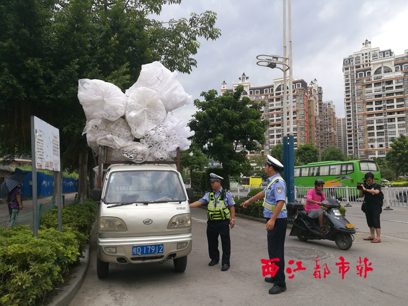 ??? 8月9日,在梧州第七中學對開路段,民警將一輛違規運載貨物的貨車截停。該貨車運載的貨物已遠遠超出車輛擋板高度,一旦貨物掉落,將危及過往車輛或行人。西江都市報記者 陳雨燕 攝