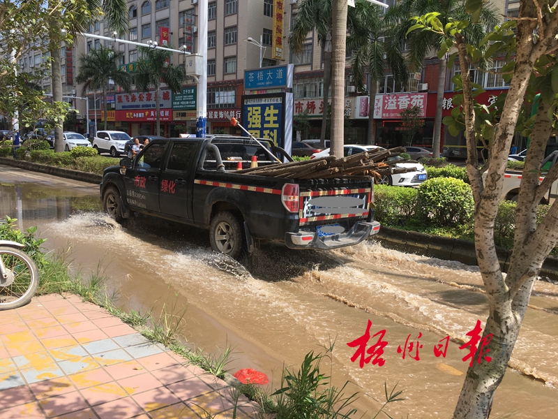 ??? 8月7日上午,記者來(lái)到蒼梧大道路口了解情況。在帝龍酒店門口,確實(shí)有一段路滿是積水,這還是經(jīng)過(guò)一個(gè)晚上的蒸發(fā)了后的情況,記者看到這段路的積水還是幾乎漫過(guò)路牙??上攵?,遇到暴雨,這段路就可謂是“水漫金山”的景象。這一路段時(shí)常有車輛經(jīng)過(guò),車輛經(jīng)過(guò)的時(shí)候會(huì)把積水濺起,車輛速度慢還不至于濺得太厲害,車輛速度快的話就像潑水一樣,周圍的行人避之不及。積水中還漂浮著一些垃圾,因?yàn)榉e水的緣故,環(huán)衛(wèi)工人不能及時(shí)清理。