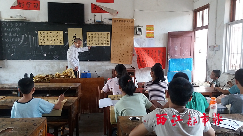 ?梁立志在義務書法培訓班上為孩子們講解漢字結構。 西江都市報記者 紀榮蘭 攝