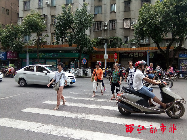????8月15日11時,在蝶山一路三云酒家對出的斑馬線上,數名市民正在過馬路,一輛白色小汽車停車讓行,同向行駛的一輛摩托車卻搶在市民面前通過斑馬線。 西江都市報記者 陳雨燕 攝