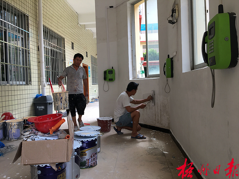 ????8月15日,在長洲區(qū)新興小學(xué),施工人員正粉刷墻面。