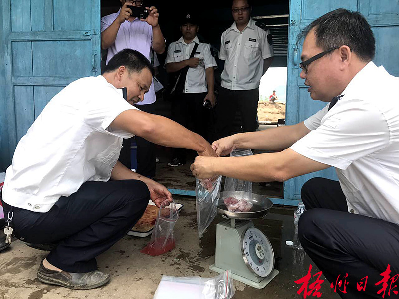 ????8月16日,在蒼梧縣京南鎮新寨網箱水產養殖合作社網箱魚排,市、縣兩級漁政部門執法人員進行養殖用藥抽樣檢測。