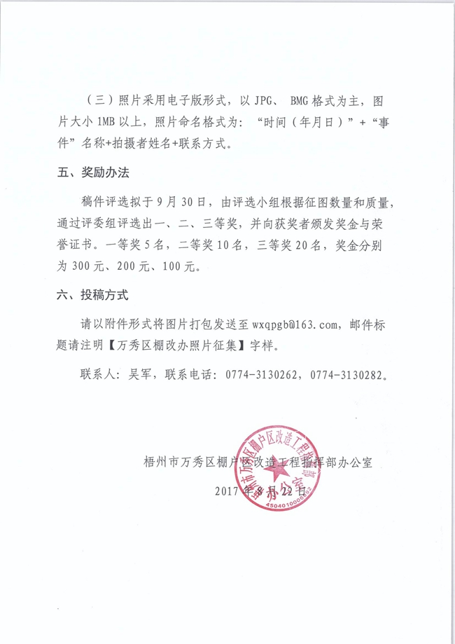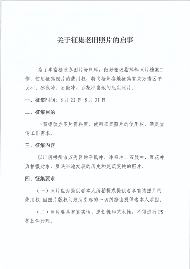 ??? 為了豐富棚改辦圖片資料庫(kù),做好棚改指揮部照片檔案工作,使用征集照片的使用權(quán),特向梧州各地征集有關(guān)萬(wàn)秀區(qū)平民沖、冰泉沖、石鼓沖、百花沖當(dāng)?shù)氐募o(jì)實(shí)照片。 ????一、征集時(shí)間:8月22日-8月31日 ????二、征集目的 ????豐富棚改辦圖片資料庫(kù),使用征集照片的使用權(quán),滿足宣傳工作需求。 ????三、征集內(nèi)容 ????以廣西梧州市萬(wàn)秀區(qū)的平民沖、冰泉沖、石鼓沖、百花沖為拍攝對(duì)象,反映當(dāng)?shù)匕l(fā)展的歷史和建筑變換的照片。 ????四、征集要求 ????(一)照片應(yīng)為提供者本人所拍攝或提供者享有該照片的使用權(quán),因照片版權(quán)問(wèn)題所引起的一切糾紛由提供者本人承擔(dān)。 ????(二)照片要具有真實(shí)性、原創(chuàng)性和藝術(shù)性,不得進(jìn)行PS等軟件處理。 ????(三)照片采用電子版形式,以JPG、 BMG格式為主,圖片大小1MB以上,照片命名格式為:“時(shí)間(年月日)”+“事件”名稱+拍攝者姓名+聯(lián)系方式。 ????五、獎(jiǎng)勵(lì)辦法 ????稿件評(píng)選擬于9月30日,由評(píng)選小組根據(jù)征圖數(shù)量和質(zhì)量,通過(guò)評(píng)委組評(píng)選出一、二、三等獎(jiǎng),并向獲獎(jiǎng)?wù)哳C發(fā)獎(jiǎng)金與榮譽(yù)證書。一等獎(jiǎng)5名,二等獎(jiǎng)10名,三等獎(jiǎng)20名,獎(jiǎng)金分別為300元、200元、100元。 ????六、投稿方式 ????請(qǐng)以附件形式將圖片打包發(fā)送至wxqpgb@163.com,郵件標(biāo)題請(qǐng)注明【萬(wàn)秀區(qū)棚改辦照片征集】字樣。 ????聯(lián)系人:吳軍,聯(lián)系電話:0774-3130262,0774-3130282。 ????梧州市萬(wàn)秀區(qū)棚戶區(qū)改造工程指揮部辦公室 ????2017年8月22日   |