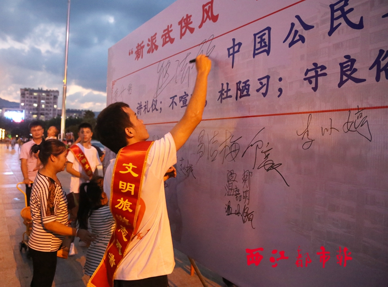 ??? 文明旅游志愿者們在“新派武俠風·醉美蒙山情”文明旅游簽名墻上簽下自己的名字。
