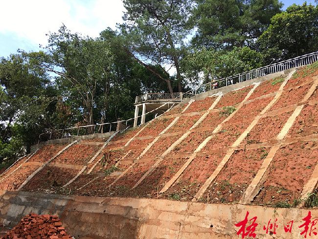 ??? 8月25日,在梧州一中(高中部)不穩(wěn)定邊坡治理工程施工現(xiàn)場(chǎng),施工人員在新砌筑的護(hù)坡頂部通道安裝護(hù)欄,工程將在秋季新學(xué)期開(kāi)學(xué)后全面竣工。梁燕如 攝