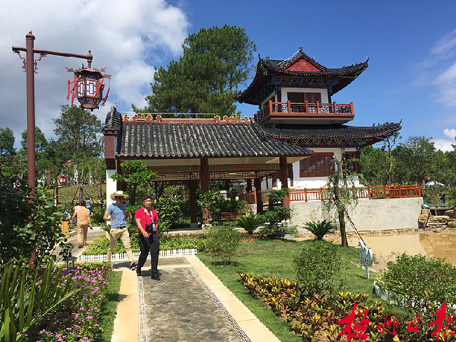 ????8月29日,第十屆廣西園林園藝博覽會在賀州市開幕,我市舉行城市活動日暨梧州園開園儀式。圖為游客在梧州園游覽以鶴崗樓為原型設(shè)計的松風閣。梁萍 攝