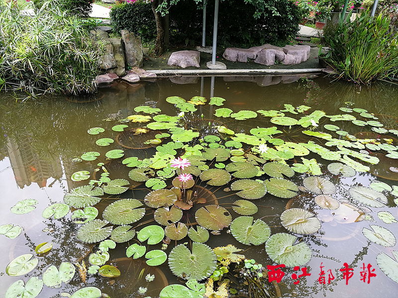 ????水生植物池中,部分新引種的蓮花已經開放。 西江都市報記者 吳艷虹 攝