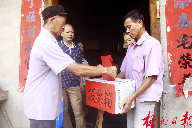????8月30日,蒙山縣黃村鎮明覺村舉行第八屆村民委員會換屆選舉,行動不便的選民通過流動票箱投票。