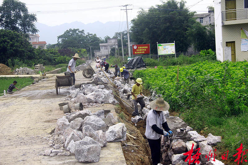 ????8月27日,在蒙山縣文圩鎮(zhèn)通往羽生谷漂流景區(qū)公路,工人正砌筑路基拓寬道路。