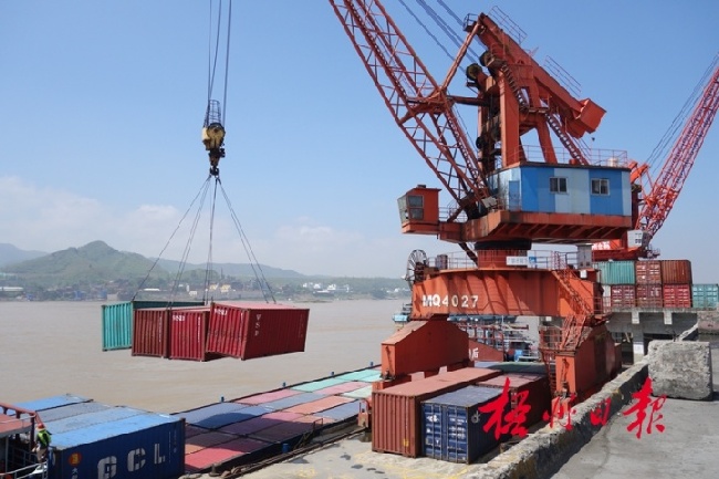 ??? 8月30日,在廣西梧州中外運倉碼有限公司李家莊碼頭,起重機正進行集裝箱裝卸作業。今年以來,李家莊碼頭依托西江黃金水道快速便利的水運條件,貨物中轉運輸業務量穩步上升。據統計,1至7月李家莊碼頭集裝箱吞吐量達18.31萬標準箱,占全市集裝箱吞吐量的57.61%。祝琳 攝
