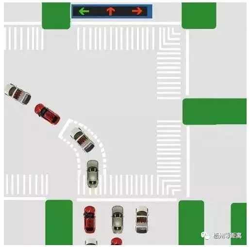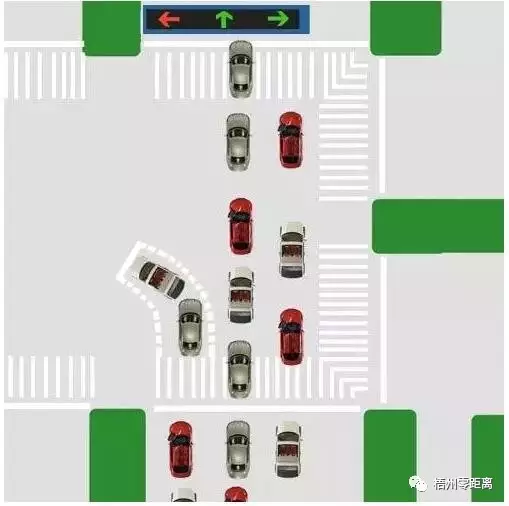 ????step 3、等到左轉彎信號燈綠燈亮時,等候在左轉待轉區的車輛可通過路口,如下圖: