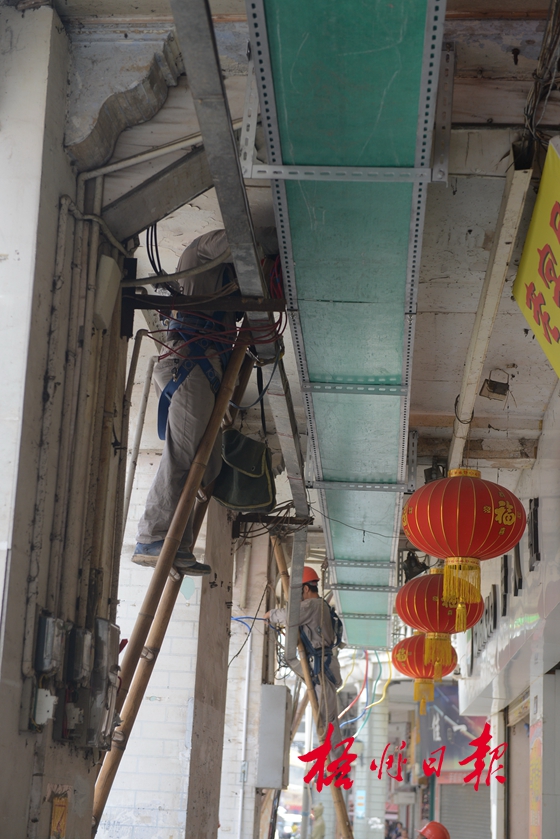 ??? 9月1日,市光明電力有限公司的工人在大南路沿街騎樓下架設(shè)新的電力線路。