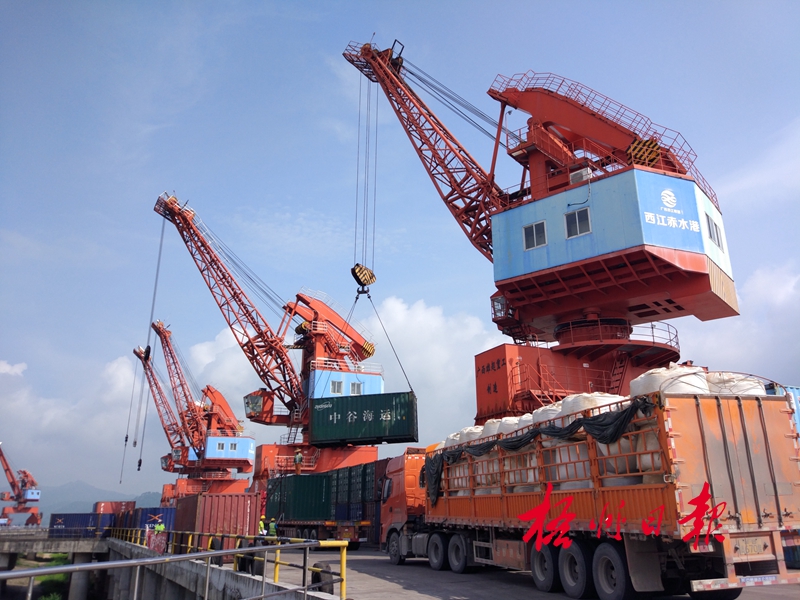 ??? 9月6日,在梧州臨港經(jīng)濟(jì)區(qū)赤水碼頭,起重機(jī)正進(jìn)行集裝箱裝卸作業(yè)。
