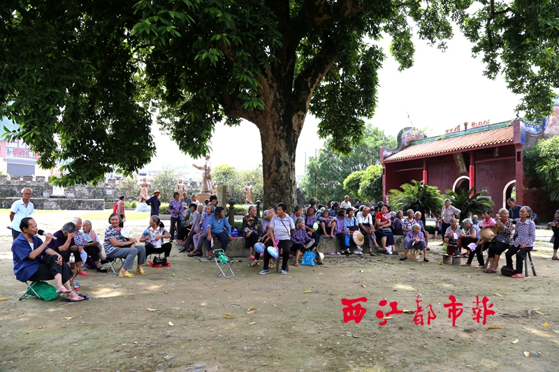 ??? 兩名老人在大樹下對向而坐,各自手持麥克風(fēng),用山歌傳唱新生活。