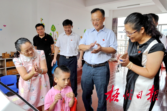 ??? 9月7日上午,市委書記黃俊華來到市特殊教育學校,看望慰問堅守在一線的特教老師。黃俊華饒有興趣地觀看了在校兒童的手動圖片語言康復訓練,并為孩子的成功展示鼓掌激勵。 孟亞西 攝