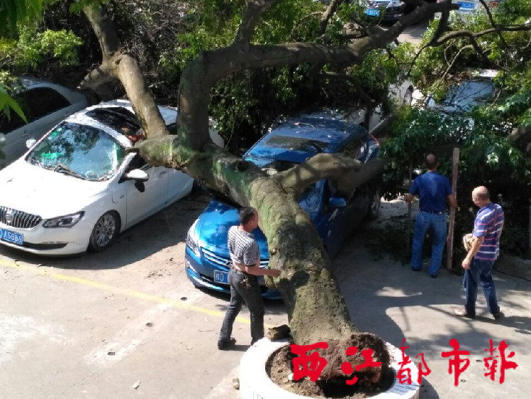 ????9月8日?,在藤縣政府大院內(nèi),一棵大樹將幾輛小轎車壓住。
