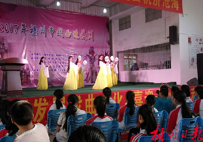 ??? 9月8日下午,喜迎十九大“深入生活,扎根人民”基層文化惠民演出暨2017年梧州市“戲曲進(jìn)校園”活動在梧州四中舉行。圖為梧州四中學(xué)生表演戲曲。 李欣鞠 攝