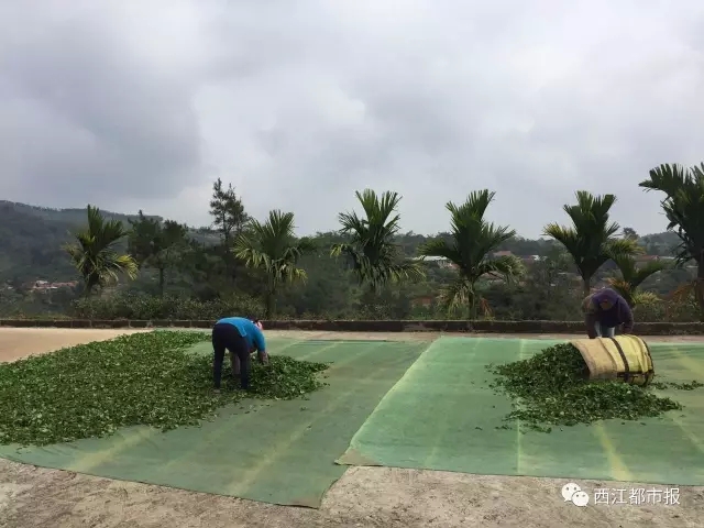 63茶園里,兩名茶農(nóng)正在晾曬剛采摘的茶葉。 龍?zhí)靷?攝