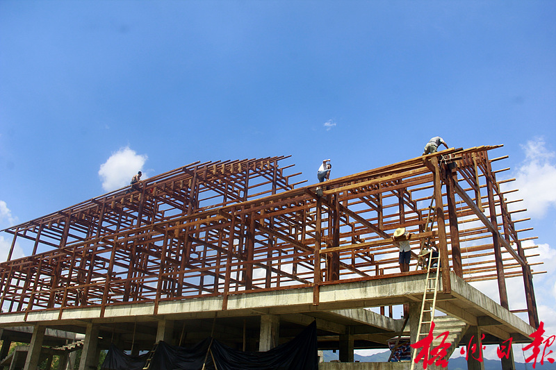 ????9月10日,蒙山縣羽生谷養生休閑基地工人在用杉木建設漂流游客中心。
