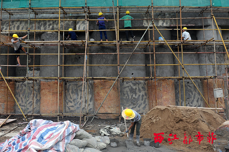 ????9月8日,在市區白云路,施工人員對整治項目路段的擋土墻進行抹灰。