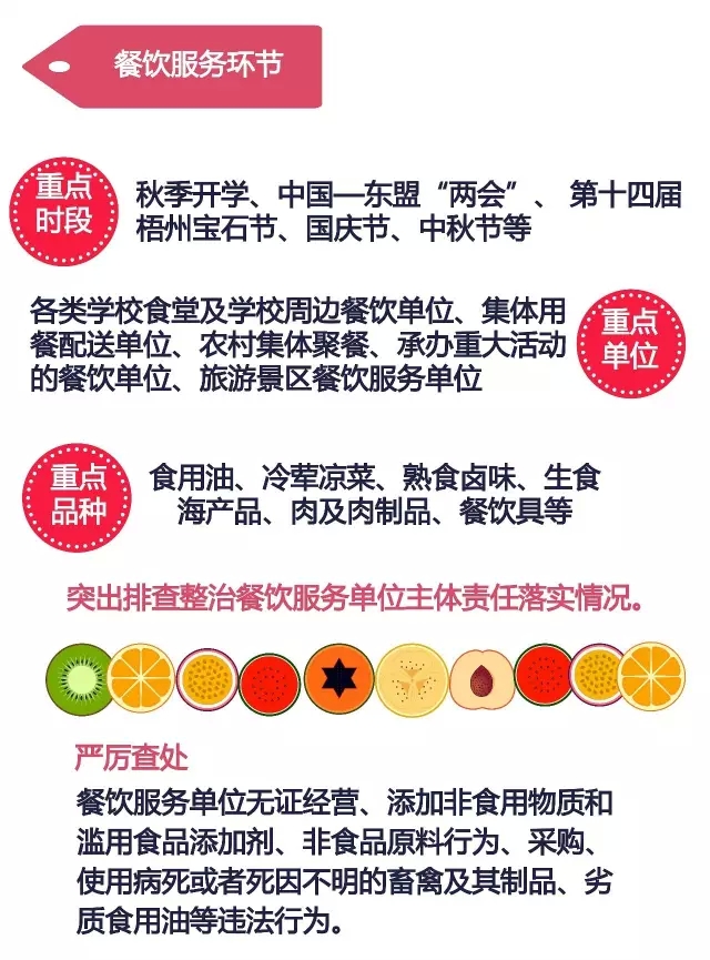 ??? 據悉,為及時排查化解食品安全領域的各類風險隱患,堅決防范系統性、區域性食品安全風險,堅決防止發生重特大食品安全突發事件,保障廣大人民群眾身體健康和生命安全,為黨的十九大勝利召開創造和諧穩定的社會環境,梧州市定于8月底至11月底,在全市范圍內開展食品安全隱患大排查大整治活動。