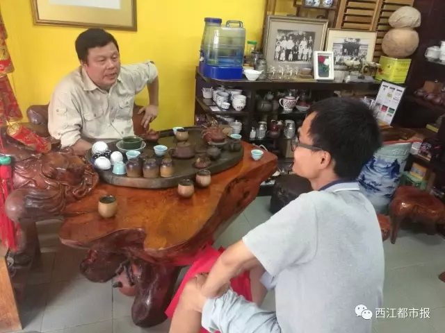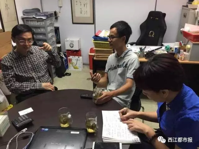 魏榮南(左一)向記者介紹梧州六堡茶昔日在新加坡的銷售情況。 文/蘇愛清 楊麥 龍?zhí)靷?/p> 圖/除署名外,龍?zhí)靷?/p> |