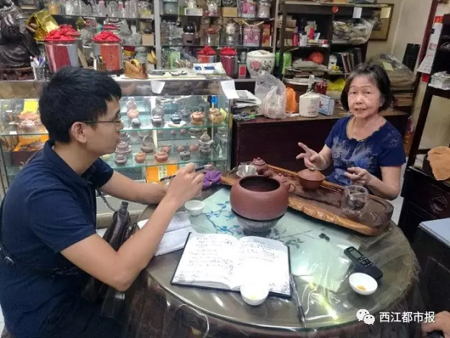 記者向劉秀鳳(右一)了解廣珍茶莊銷售梧州六堡茶的情況。