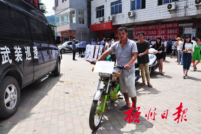 9月14日上午,在蒼梧縣嶺腳鎮,群眾領回先前被盜的摩托車。