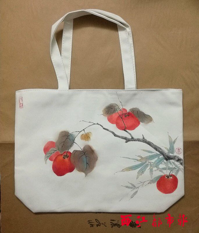 ????記者見到李正娛時,她正在位于豐業(yè)花園小區(qū)東門旁的工作室內忙活。從她的服飾很容易感受到中國傳統(tǒng)文化的印記,她身穿一襲素色裙子,腰間位置是一支開放的蓮花,不仔細看,會以為花是印制上去的。畫桌上,擺著一只帆布包,像她身上的裙子一樣,這些都是李正娛的“畫紙”。只見她手拿畫筆,在白色的帆布包上繪畫,不一會,一只橙黃的柿子和兩片暗黃的柿葉躍然帆布包上。