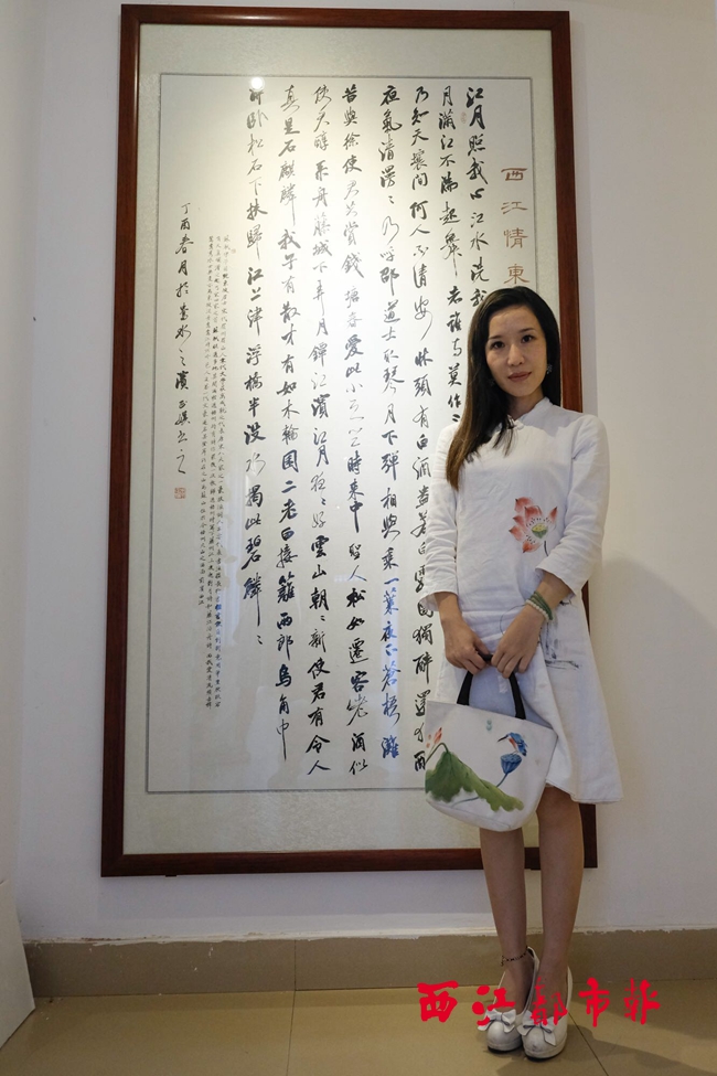 不管是衣服上的蓮花,還是帆布包上的翠鳥,以及身后的書法作品,都出自李正娛之手。 西江都市報記者 楊揚 攝