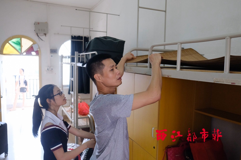 9月18日,在梧州學院學生宿舍,家長幫助大一新生整理床鋪。西江都市報記者 楊揚攝