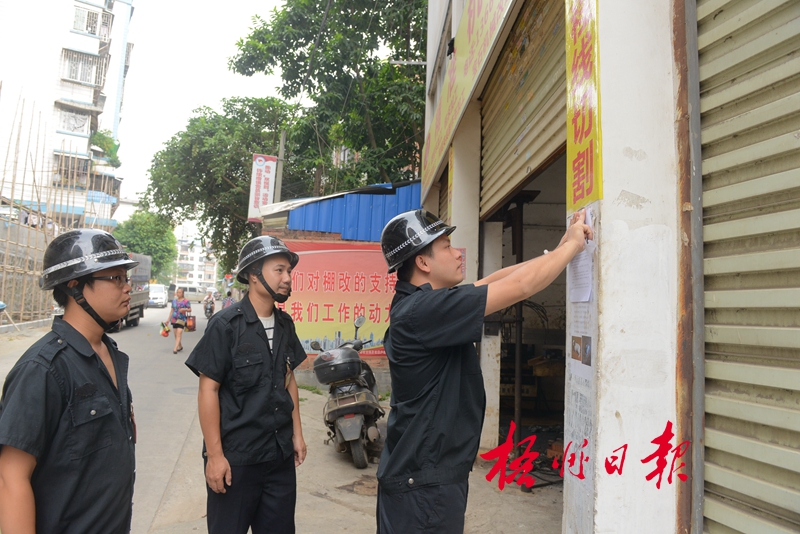 ??? 9月19日,在富民一路洪堤巷,工作人員正在一棟違法建筑門前張貼處罰(聽證)告知書。