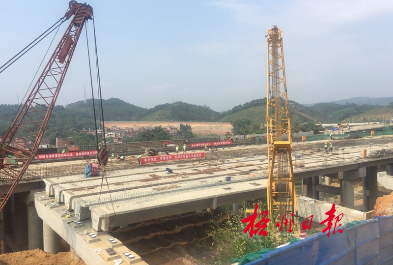 ??? 9月19日,梧柳高速公路倒水互通立交正在進行架梁和橋面鋪裝施工。