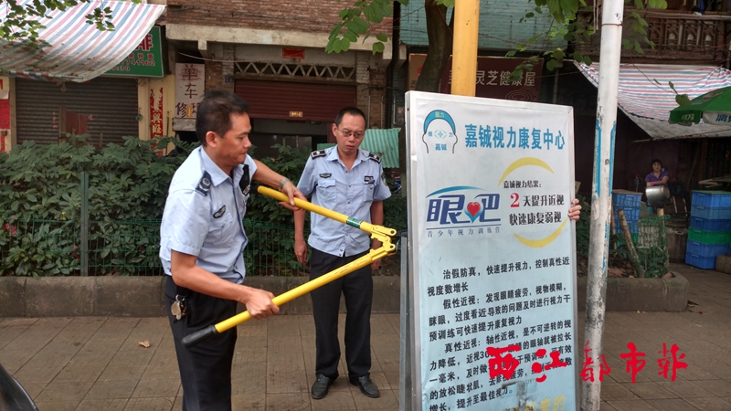 ??? 9月20日,城管執法人員正在拆除云蓋路大東小學對面人行道上的一處私設廣告牌。