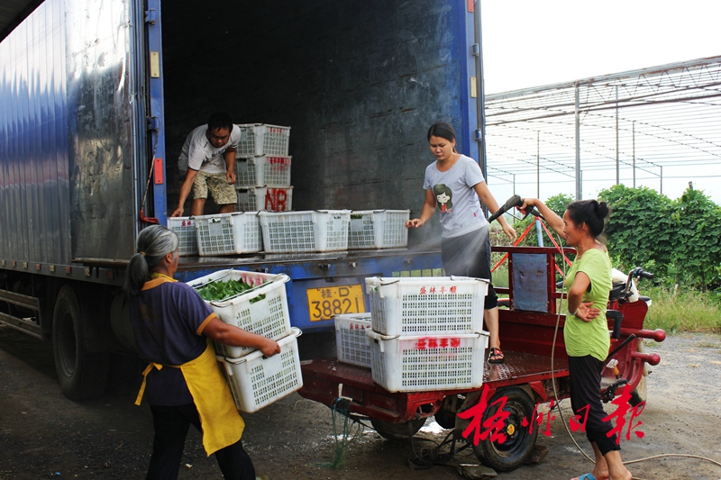 ??? 9月19日,藤縣盛林豐順蔬菜種植基地的工人在裝運蔬菜。
