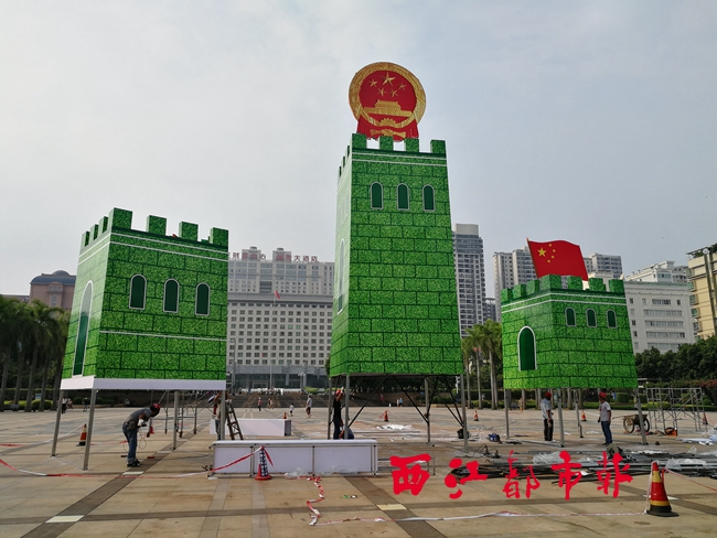 9月21日,在市政廣場,市政部門的施工人員正在搭建“綠色長城”鐵架造型。 吳艷虹 攝