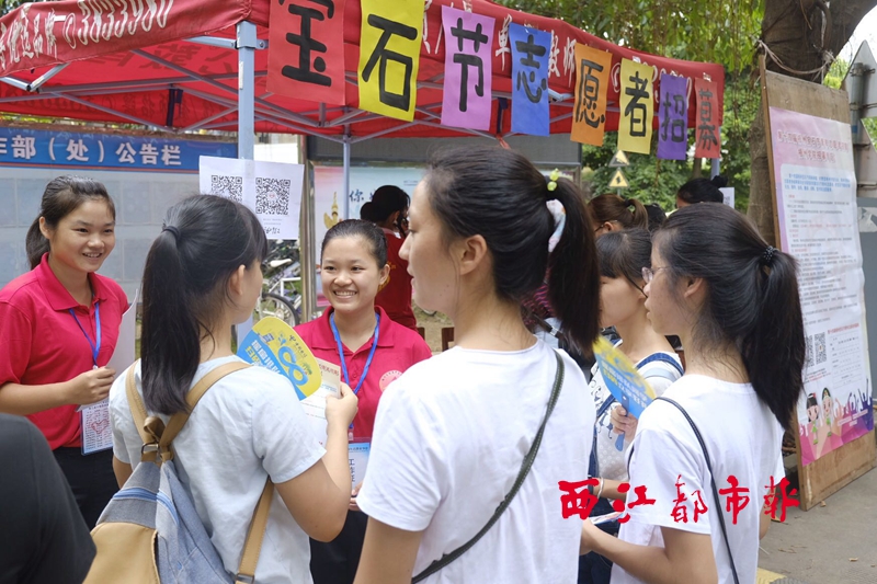 ??? 9月20日,在梧州學院,不少大學生在寶石節(jié)志愿者招募點前咨詢和報名。